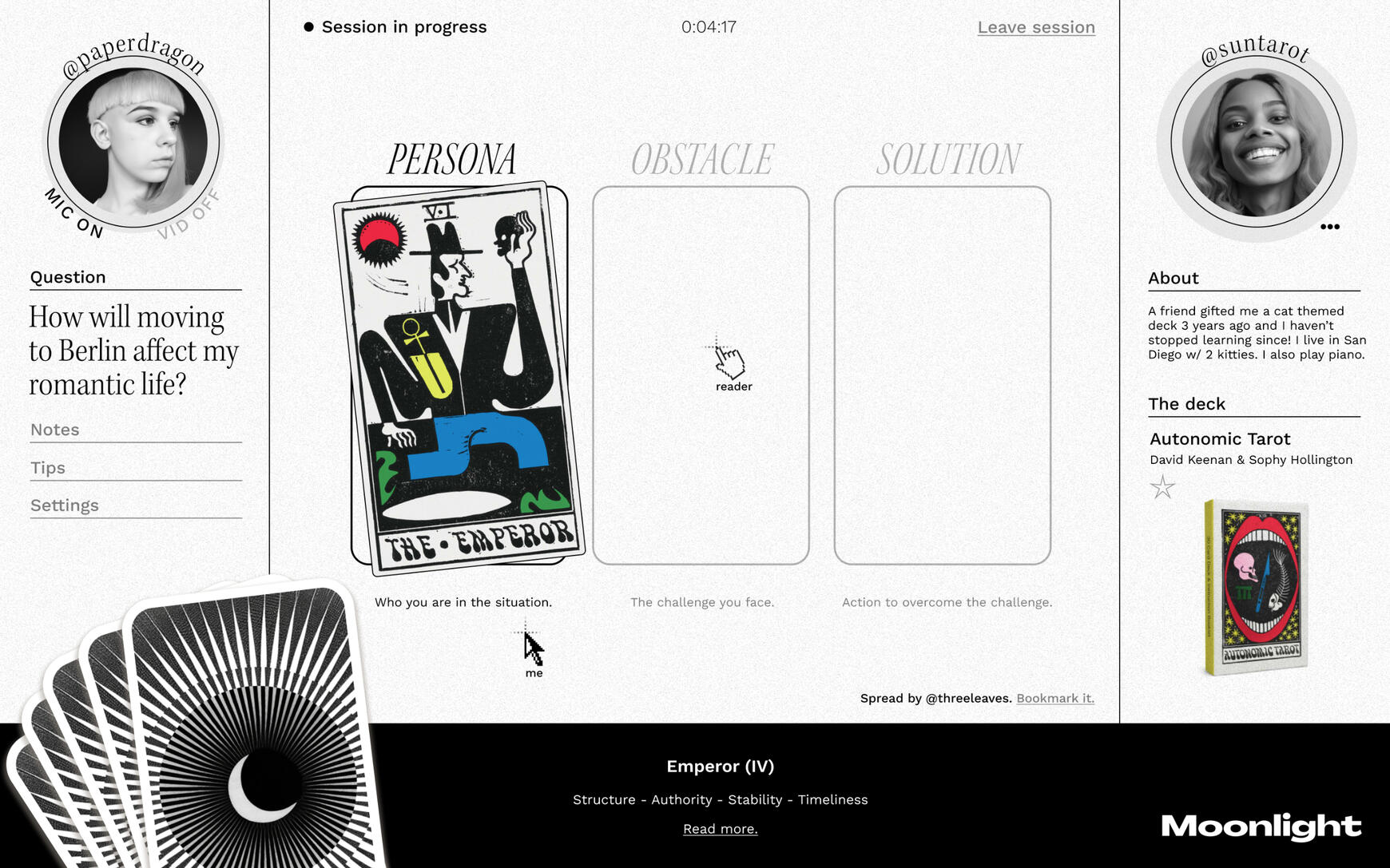 Moonlight aims to solve these problems by creating a trusted community of tarot readers and tools for interactive sessions.